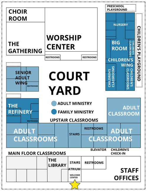 Here is a map of our facility. The star is where you will enter our building from the North parking lot. To head to our worship center, go through the atrium toward the courtyard!